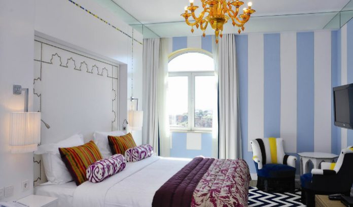 No hotel estão presentes elementos como riscas, que nos remetem para um espírito de Riviera, mas também apontamentos portugueses.