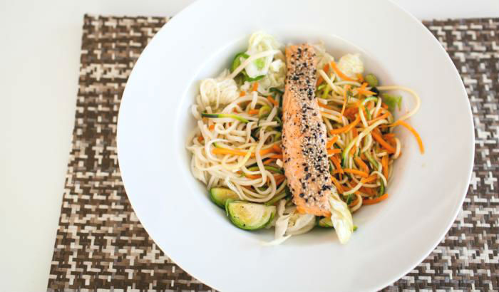 Coisas como tajine de grão, beringela e caju, e salmão com sementes de sésamo sobre udon e curgete espiralizada. E há ainda a «proteína do dia», um prato quente que pode ser vegetariano, carne ou peixe.