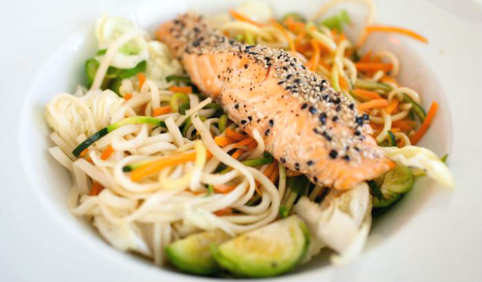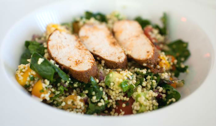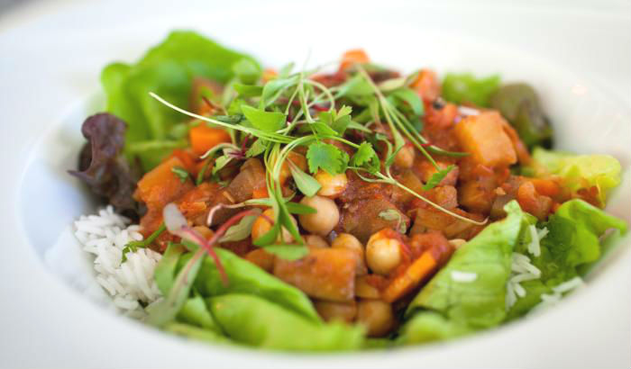 Coisas como tajine de grão, beringela e caju, e salmão com sementes de sésamo sobre udon e curgete espiralizada. E há ainda a «proteína do dia», um prato quente que pode ser vegetariano, carne ou peixe.