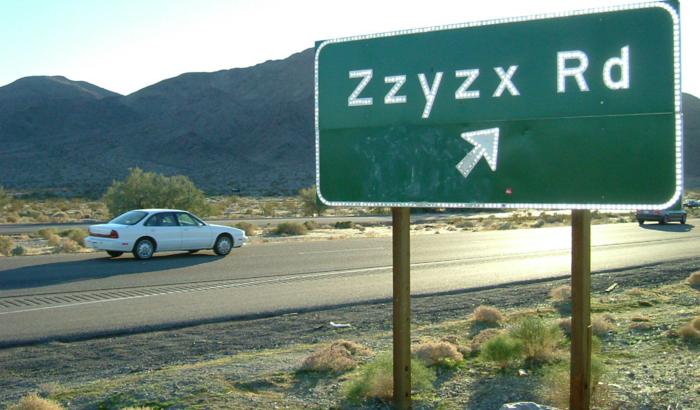 1. ZZYZX (EUA): Diz-se que, por ordem alfabética, é o último local do mundo. Fica no deserto de Mojave e é uma antiga estância termal, hoje convertida no Desert Studies Center da Universidade da Califórnia.