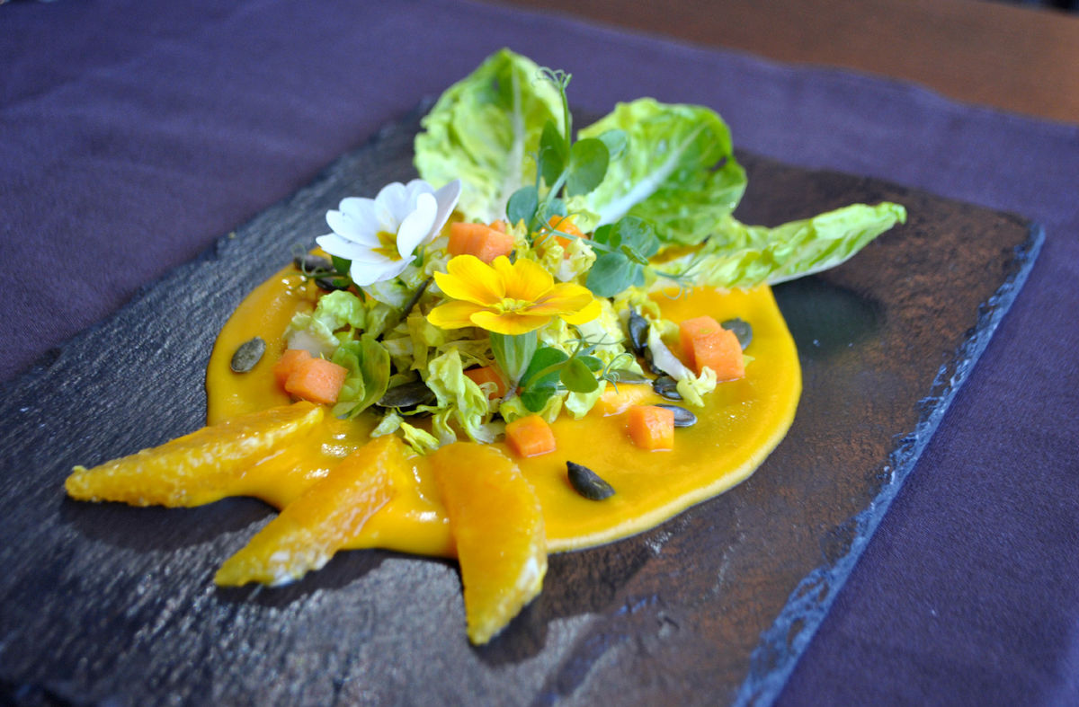 Salada de abóbora e citrinos com folhagens tenras e pevides
