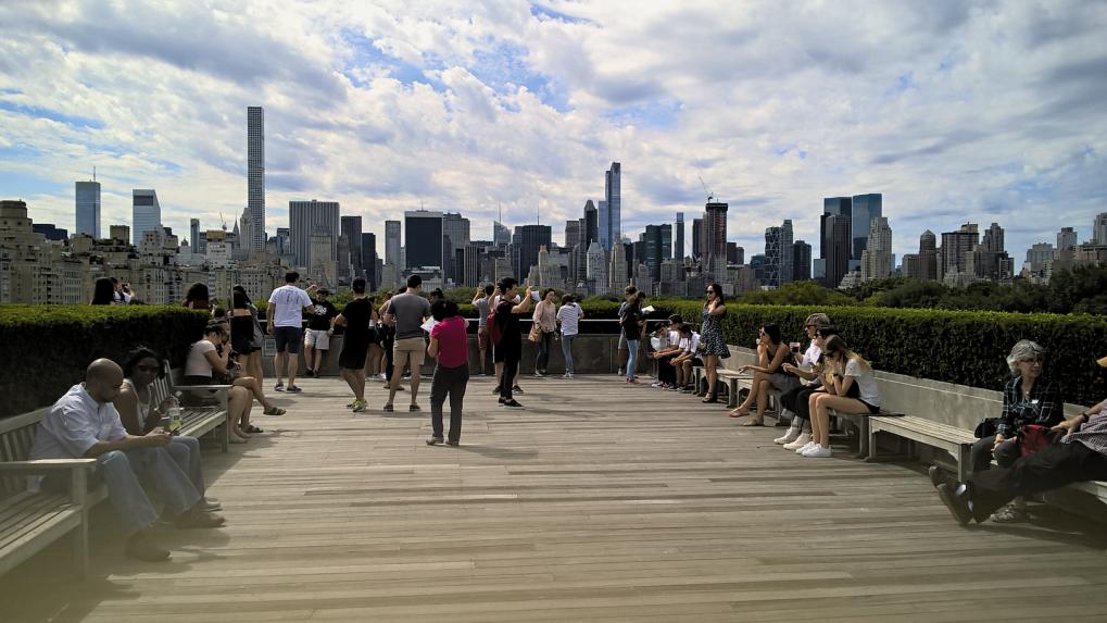 Esta foto foi tirada em setembro de 2016 no MET – Metropolitan Museum of Art (Nova Iorque). Depois de uma visita por aquele que é um dos maiores e mais importantes museus de arte mundiais, é impossível não subir ao 5.º andar e desfrutar da vista esmagadora do terraço que se espraia sobre o Central Park. A moldura de verde amortece a dureza do betão mais ao fundo, esse que recorta o céu e dá a esta imagem um misto de bucólico e urbano.
