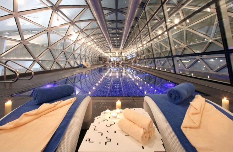 A piscina aquecida fica na área Fit and Fly Spa do hotel, que também possui uma sauna, banheira de hidromassagem e ginásio. Há fatos de banho disponíveis para os visitantes que não vêm preparados. Os passageiros do aeroporto podem comprar um cartão Sn'PA de duas horas por cerca de 33 euros.