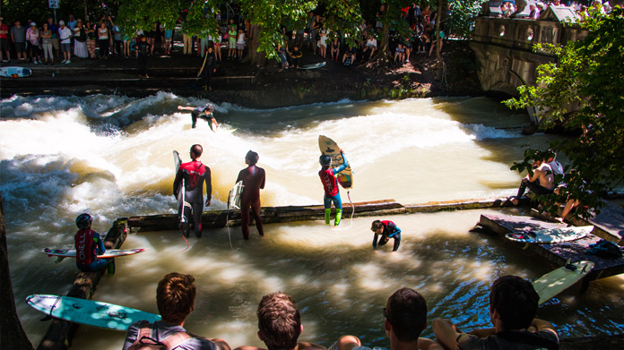 Ver um surfista completamente equipado, prestes a apanhar uma onda, quando a praia mais próxima fica a 400 km, não é comum. Contudo, Munique não é uma cidade comum.