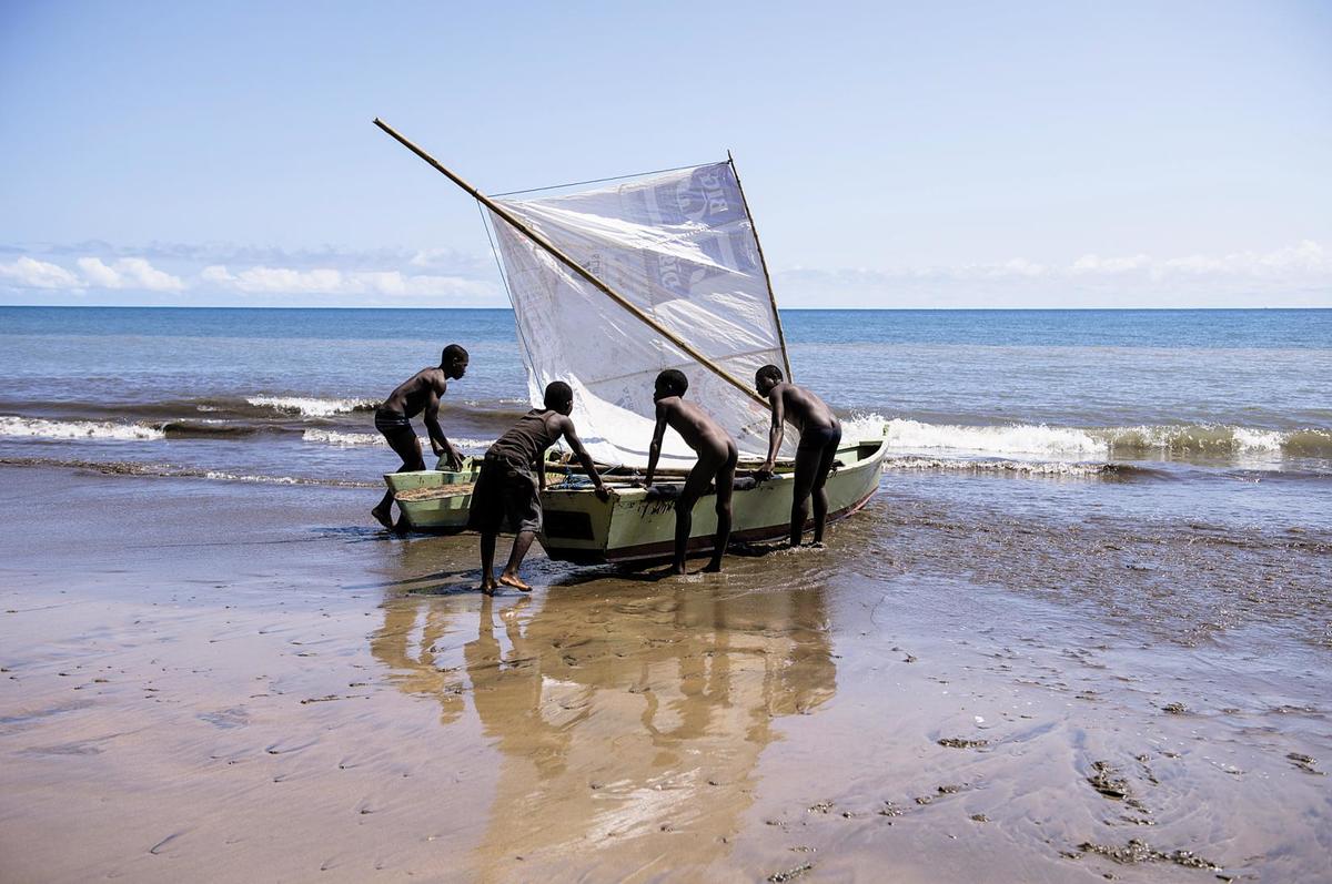 O dia seguinte começa muito cedo, às seis da manhã, já com sol e calor. Numa carrinha de nove lugares partimos à descoberta do Sul. À saída da cidade, a primeira paragem: praia Melão e a sua comunidade piscatória à beira da estrada. Na areia, as pirogas estão apontadas para o mar e os homens trabalham as redes. Do lado de lá da via, numa casa de madeira, há tempo para uma conversa com o senhor Estêvão. De pé, e agarrado à sua velha máquina de costura, fala sem desviar o olhar de cada linha de pontos que traça. As motos chinesas a quatro tempos e as carrinhas de caixa aberta a transportarem pessoas e animais vão passando entre nós e a praia.