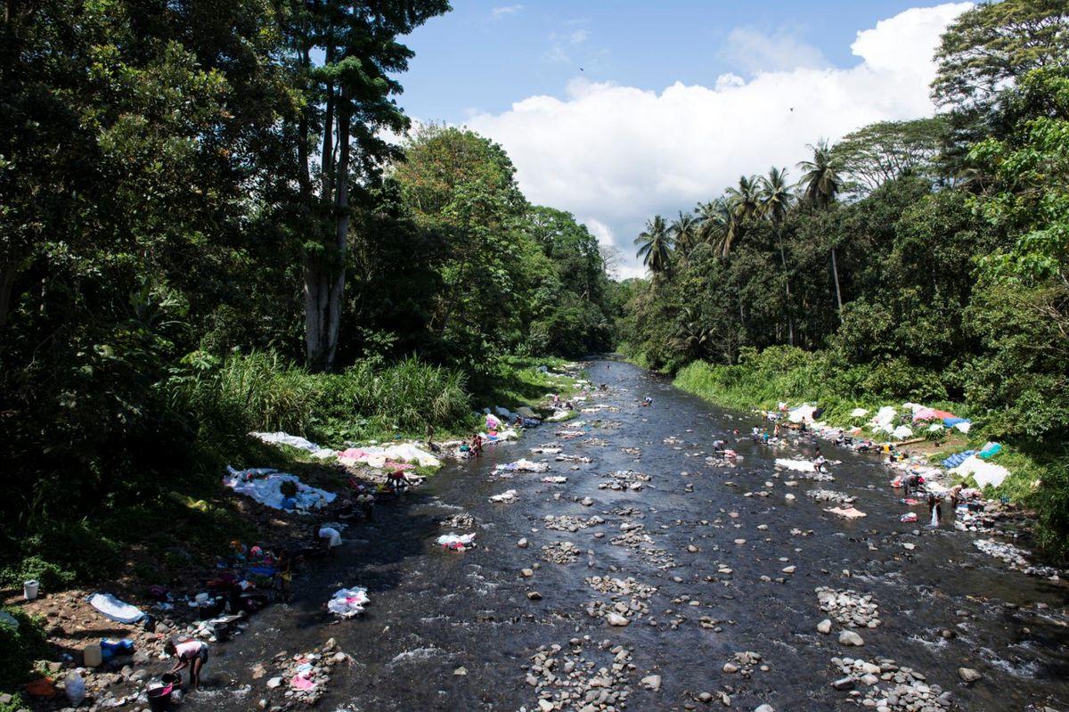 À medida que nos dirigimos para sul, os arredores da cidade começam a ser trocados pelo verde. Quando o guia encosta a carrinha pouco à frente de uma ponte, a tonalidade é outra. Passam a ser muitas, vestidas e manuseadas pelas mulheres que lavam a roupa no rio Abade, nascido nos picos de São Tomé e desaguado na praia de Água Izé. Debruçados no muro de proteção lateral da ponte, admiramos aquela rotina, realidade de um país pobre financeiramente, mas rico na simplicidade.