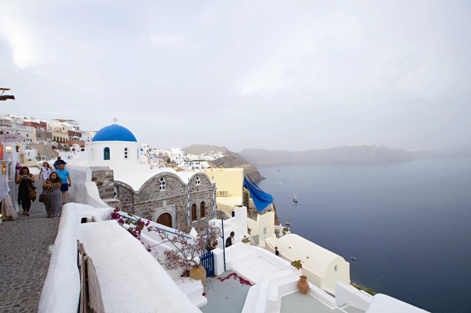 Tudo o que se leia, ouça contar, veja nos milhares de imagens que estão na internet, nada nos prepara para aquele primeiro vislumbre de Santorini quando sobrevoamos a ilha. Casinhas brancas e azuis literalmente penduradas em rochas escarpadas, num contraste perfeito entre a sua alvura, o azul do céu e o tom escuro da rocha vulcânica. Tudo mergulhado num mar cristalino e brilhante. É um lugar-comum dizer que Santorini é um postal vivo, não tivesse esta ilha sido eleita em várias plataformas turísticas como uma das ilhas mais bonitas do mundo, mas essa é uma expressão que se ajusta como uma luva de seda numa mão delicada.