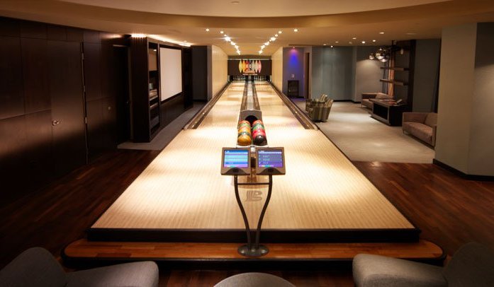 Tem duas pistas de bowling, com bolas, sapatos e até mesmo um sistema automático de pontuação. Mas se não for suficiente para se entreter, há também uma mesa de snooker, um palco, uma grande banheira de hidromassagem e um bar.