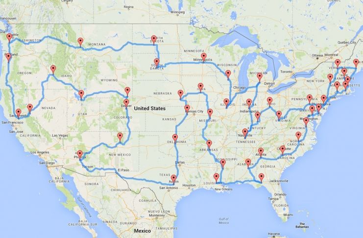 Com a ajuda de um algoritmo e do Google Maps, criou um percurso de 21,420 quilómetros entre as 48 capitais, de forma contínua. Isto é, o percurso faz que se vá sempre para a capital mais próxima, não havendo necessidade de saltitar no mapa.