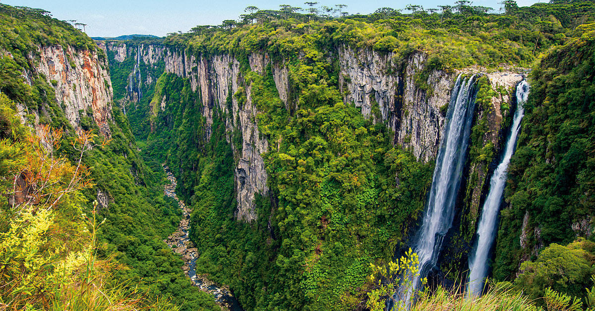 Perante um cenário destes o normal é querer chegar ao topo, mas é lá em baixo, nos vales, nos rios, nas encostas, que estão alguns dos maiores tesouros. A vegetação é exuberante, fruto da humidade e acidez do solo, com espécies remanescentes da Mata Atlântica, enquanto na parte alta aparecem os pinheiros de araucária, árvore-símbolo da região. Há pequenos e inofensivos cursos de água que acabam em grandes quedas, cachoeiras, trilhos para fazer a pé, de bicicleta, de todo-o-terreno e a cavalo, que nem um verdadeiro gaúcho. Ou de helicóptero. Basta reservar com alguma antecedência no hotel que eles tratam de tudo. Só não prometem piloto com traje típico.