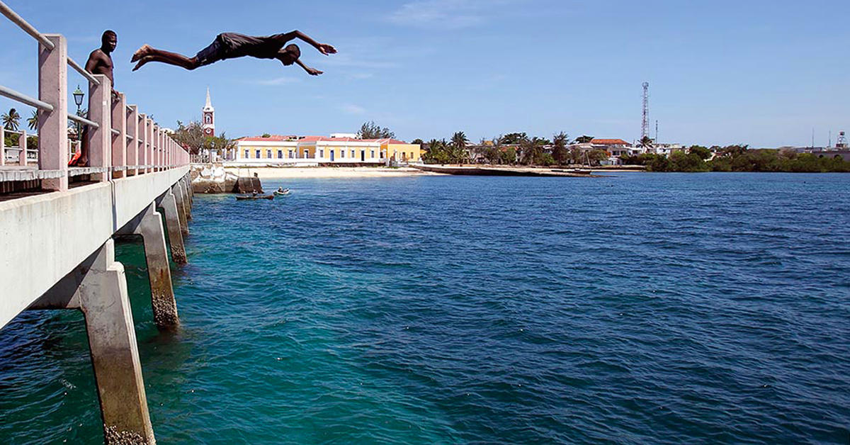 Comecemos pelo princípio, e devagar, que este não é um lugar para pressas. Atravessamos a ponte na caixa aberta de uma pick-up, as mochilas encaixadas a custo entre os cestos e as trouxas das mulheres macua cuja algazarra me esforço em vão por entender (e vice-versa: os nossos dialetos, ambos bantu, são parentes demasiado afastados), mergulhamos por minutos na transbordante cidade de macuti a que a esmagadora maioria dos 15 mil habitantes da ilha (e dos passageiros desta pick-up) chama casa, e quando regressamos à tona, já na cidade de pedra, o sossego do fim de tarde domina por completo.