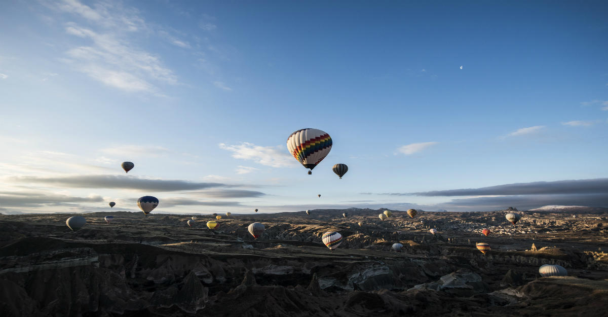 E, de novo, o balão de ar quente. Lá em baixo, a Capadócia. A Turquia é enorme. A Capadócia é uma região histórica na Anatólia Central, que ocupa várias províncias da Turquia. A partir de Istambul, a forma mais confortável de lá chegar é por avião.