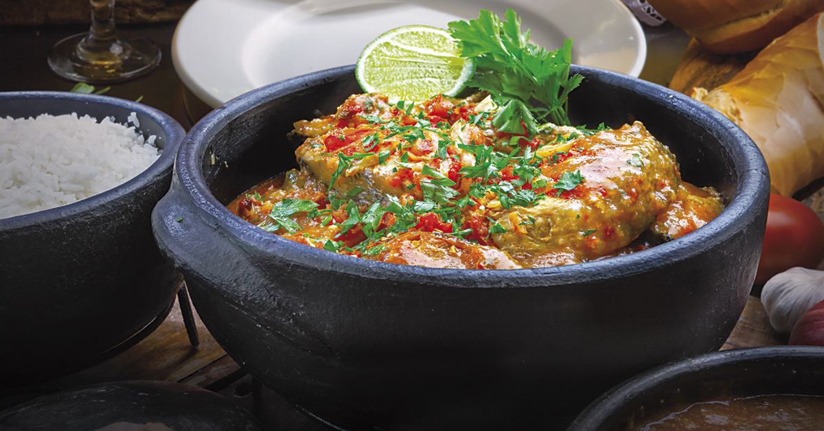 A moqueca brasileira, caracterizada pelo sabor intenso do óleo de dendê (ou de palma), tem na sua base uma espécie de estofado de peixe com tomate, pimento, cebola e ervas aromáticas. Quando é feita à moda capixaba (do estado de Espirito Santo), é servida com pirão e arroz, enquanto a moda baiana geralmente acrescenta leite de coco, camarão ou outros mariscos. A origem será indígena, também no nome: moqueca (do quimbundo mu’keka) ou poqueca (do tupi po’keka). Existem documentos do século XVI que falam sobre a forma como os índios preparavam peixe em «moquéns » (embrulhos de folhas sobre as brasas), que fazia com que cozinhasse no seu próprio suco. Hoje o prato é geralmente preparado numa panela de barro, simulando o mesmo tipo de cozedura. À origem indígena foram acrescentadas as influências africana e portuguesa. CSC