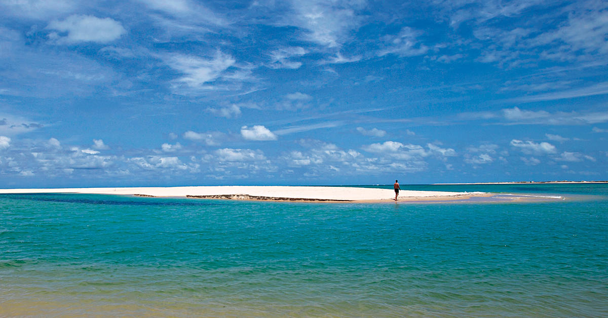 Agora que finalmente chego a este paraíso como um estrangeiro decido que o sítio de onde o quero ver fica em terra firme: do alto da imensa duna que – surpresa! – revela a imprevisível diversidade da ilha de Bazaruto, toda savana por dentro e toda praia por fora, uma praia como as que supomos que terão existido no princípio do mundo, quando ainda não fazíamos parte do ecossistema. Ou então porque é sempre bom haver um plano B, dos imensos bancos de areia que a maré‑baixa destapa na ilha de Benguerra e que a rasgam ao meio, confirmando que nasceu para ser este venturoso portal para o Índico.