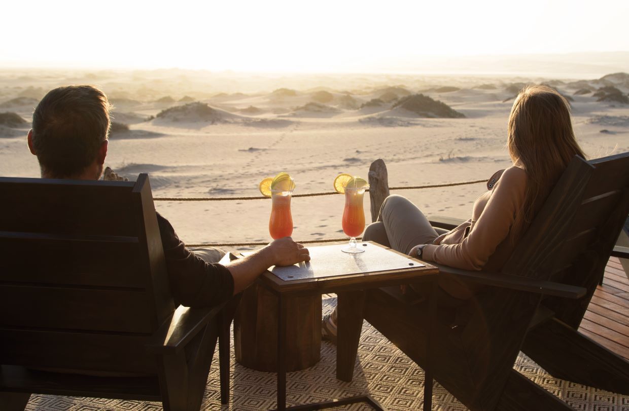 As dez cabanas de madeira (duas delas familiares) estão aninhadas entre as dunas, com vista para o mar, de onde a fria corrente de Benguela traz uma brisa refrescante. Foram desenhadas pela bioarquiteta namibiana Nina Maritz, de forma a emular os navios ali encalhados ao longo dos séculos.