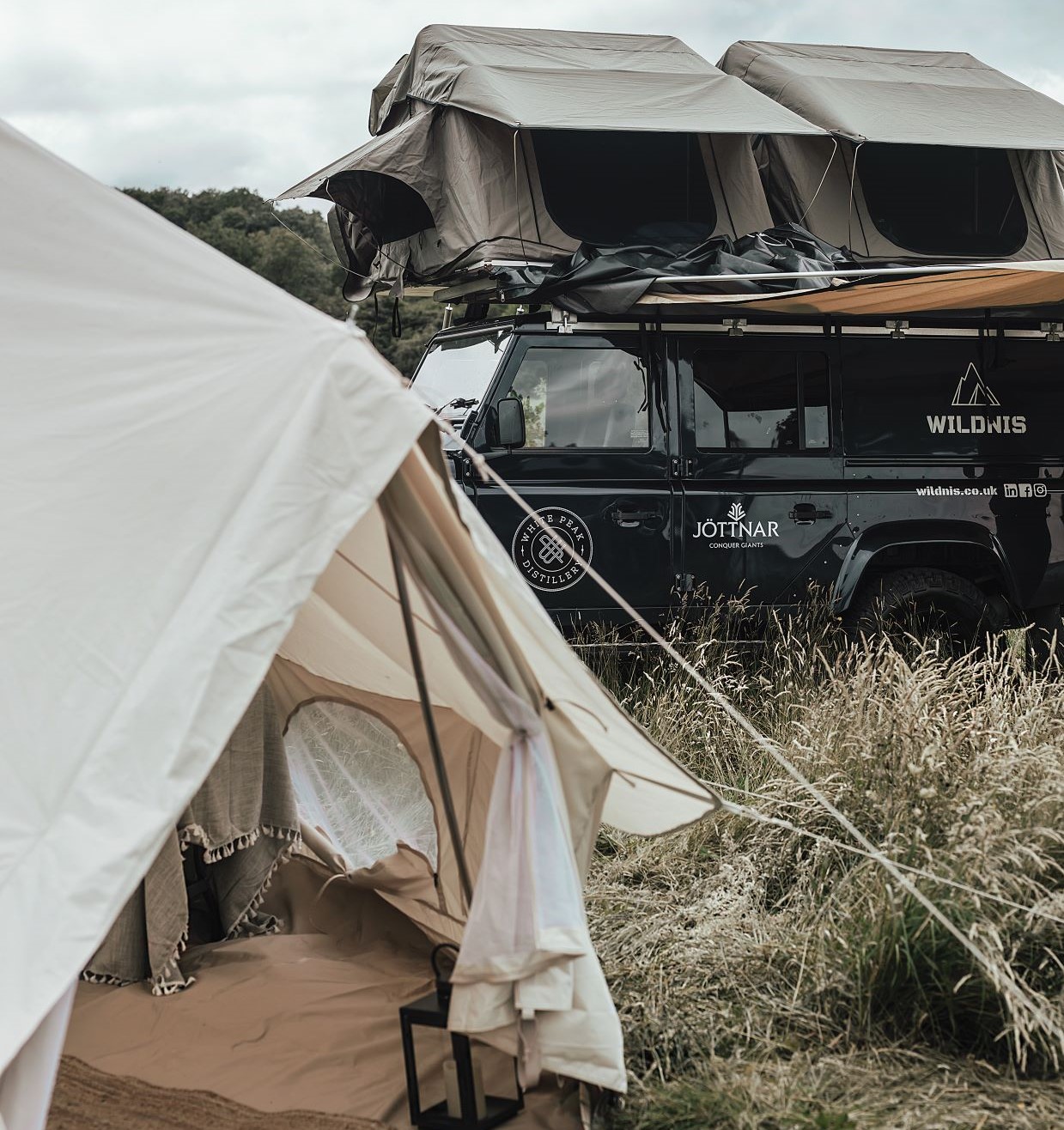 Os veículos estão adaptados para acampamento selvagem, com tendas no telhado, mas os viajantes podem fazer glamping numa bell tent.