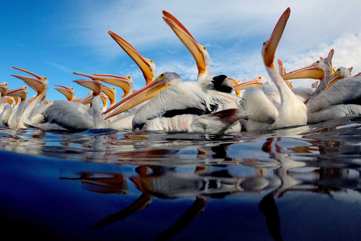 Os pelicanos, que podem medir 1,75 metros de comprimento e até três metros de largura com as asas estendidas, são caracterizados pela cor amarela do bico e pela plumagem branca.