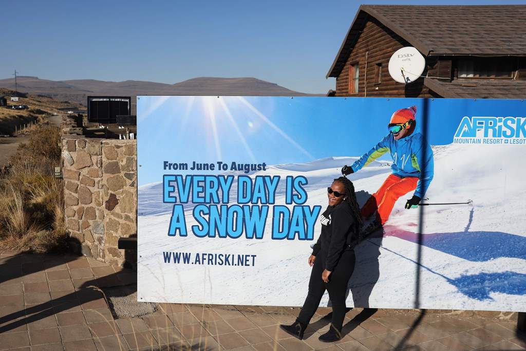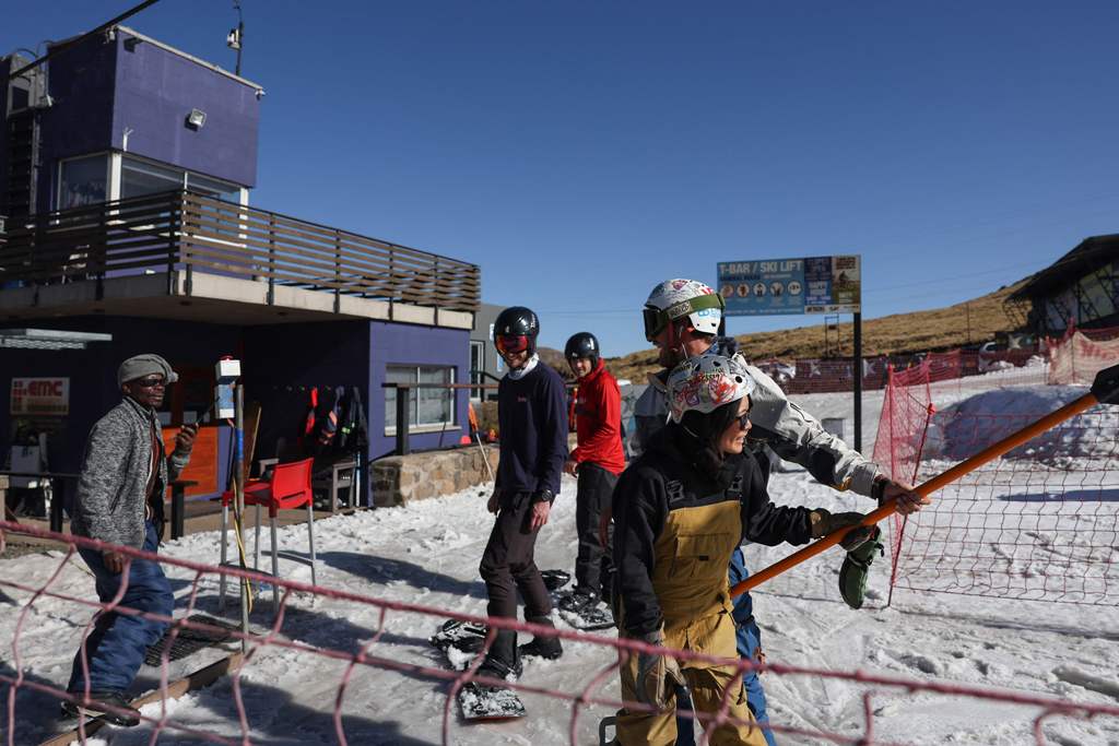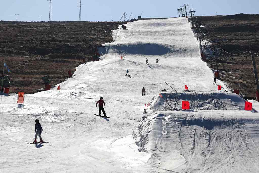 Em pelas montanhas Maluti, as três pequenas pistas são feitas de neve artificial, criada com água trazida de oito barragens das proximidades, criando uma inusitada mancha branca numa paisagem castanha e seca.