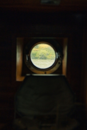 Descemos o rio a descobrir as entranhas do navio, dois decks, uma sala de estar que se torna de jantar para combater a sazonalidade e os aposentos, descendo abaixo do nível da água.